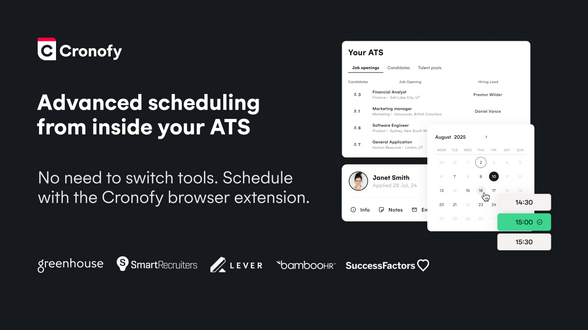 We're excited to welcome Cronofy to the community, they're the interview scheduling automation experts headquartered here in the UK. With over 75+ ATS integrations, they've made interview scheduling more efficient for teams by eliminating the low value tasks that come with manually scheduling interviews. Check out their product walk through! https://www.youtube.com/watch?si=7eIZpvO_OZGnuHyi&v=piMTxz_363g&feature=youtu.be&themeRefresh=1